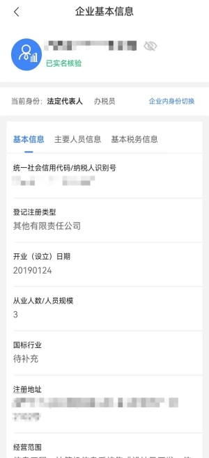 以企業(yè)身份登錄后,點(diǎn)擊【我的】進(jìn)入個(gè)人中心頁面,點(diǎn)擊“賬戶中心”進(jìn)入賬戶中心頁面。點(diǎn)擊選擇“企業(yè)信息管理”可查看登錄賬號的“基本信息”“基本人員信息”和“基本稅務(wù)信息”。
