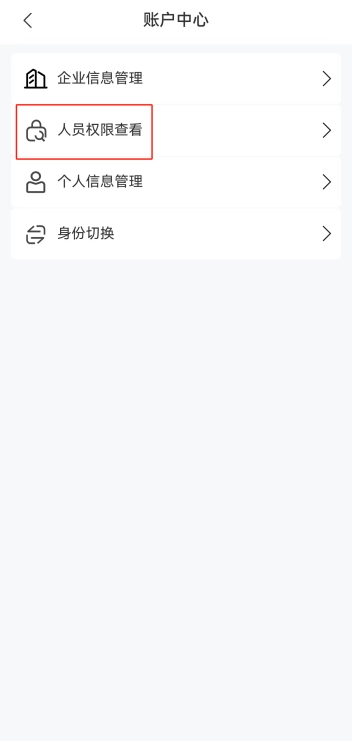 用戶登錄成功后,可以通過【賬戶中心】進(jìn)行企業(yè)信息管理、人員權(quán)限管理、人員權(quán)限查看、人員信息管理、身份切換等。