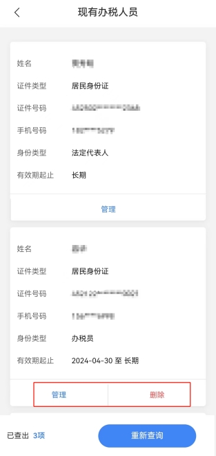 進(jìn)入賬戶中心頁面,點(diǎn)擊選擇“人員權(quán)限信息管理-現(xiàn)有辦稅人員”。錄入查詢條件(若不錄入默認(rèn)查詢?nèi)?點(diǎn)擊查詢,可查詢出現(xiàn)有辦稅人員信息的基本信息,可對現(xiàn)有辦稅人員的授權(quán)信息進(jìn)行管理或刪除人員關(guān)系(身份類型為法定代表人、財(cái)務(wù)負(fù)責(zé)人的人員關(guān)系不允許刪除)。