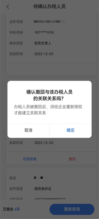 進(jìn)入賬戶中心頁面。點(diǎn)擊選擇“人員權(quán)限信息管理-待確認(rèn)辦稅人員”。錄入查詢條件(若不錄入默認(rèn)查詢?nèi)?點(diǎn)擊查詢,查詢出待確認(rèn)辦稅人員信息的基本信息,可對待確認(rèn)辦稅人員授權(quán)信息進(jìn)行查看或撤回授權(quán)(注:身份類型為法定代表人、財(cái)務(wù)負(fù)責(zé)人的人員關(guān)系不允許刪除)。