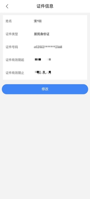 進(jìn)入賬戶中心頁面,點(diǎn)擊選擇“證件信息”可進(jìn)行證件查看,點(diǎn)擊選擇“修改”可進(jìn)行證件信息修改(注意:證件類型及證件號碼不允許修改)。